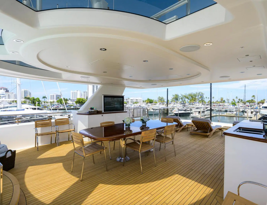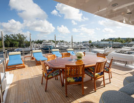 All of the outdoor areas are unique as well. The Aft Deck offers an expandable table for dining. The Boat Deck has an expansive area with Teak furniture and the Sky lounge door opens, extending the indoor/outside space. Forward of the Pilothouse, on the Portuguese Bridge, a custom bench seat with storage below.